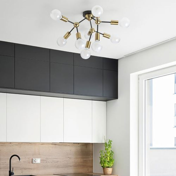 Lampada a sospensione con base per soffitto centrale e sei cavi di sospensione per lampadine con filettatura E27. Cavi di sospensione forniti con fermacavi da soffitto con possibilità di scegliere la distanza individuale dalla base. La lunghezza totale del cavo è 2m.