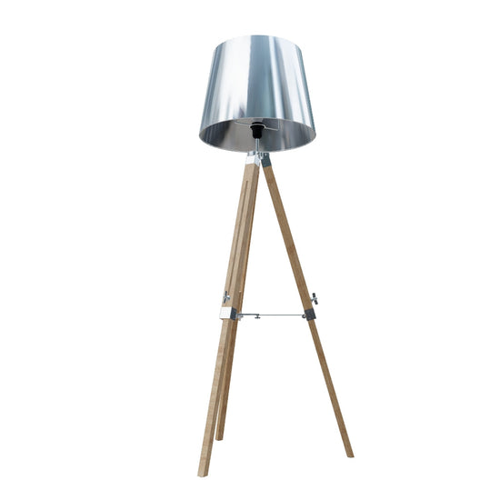 Lampada da terra con paralume in lamina cromata. La base in bambù ad altezza regolabile. Adatta per sorgenti luminose a LED con filettatura E27.