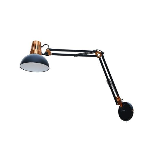 Lampada da lavoro da parete con braccio regolabile e interruttore sulla base.