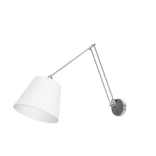 Lampada da parete con braccio regolabile, paralume in tessuto e interruttore sulla base.