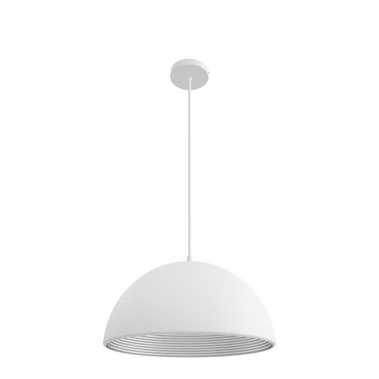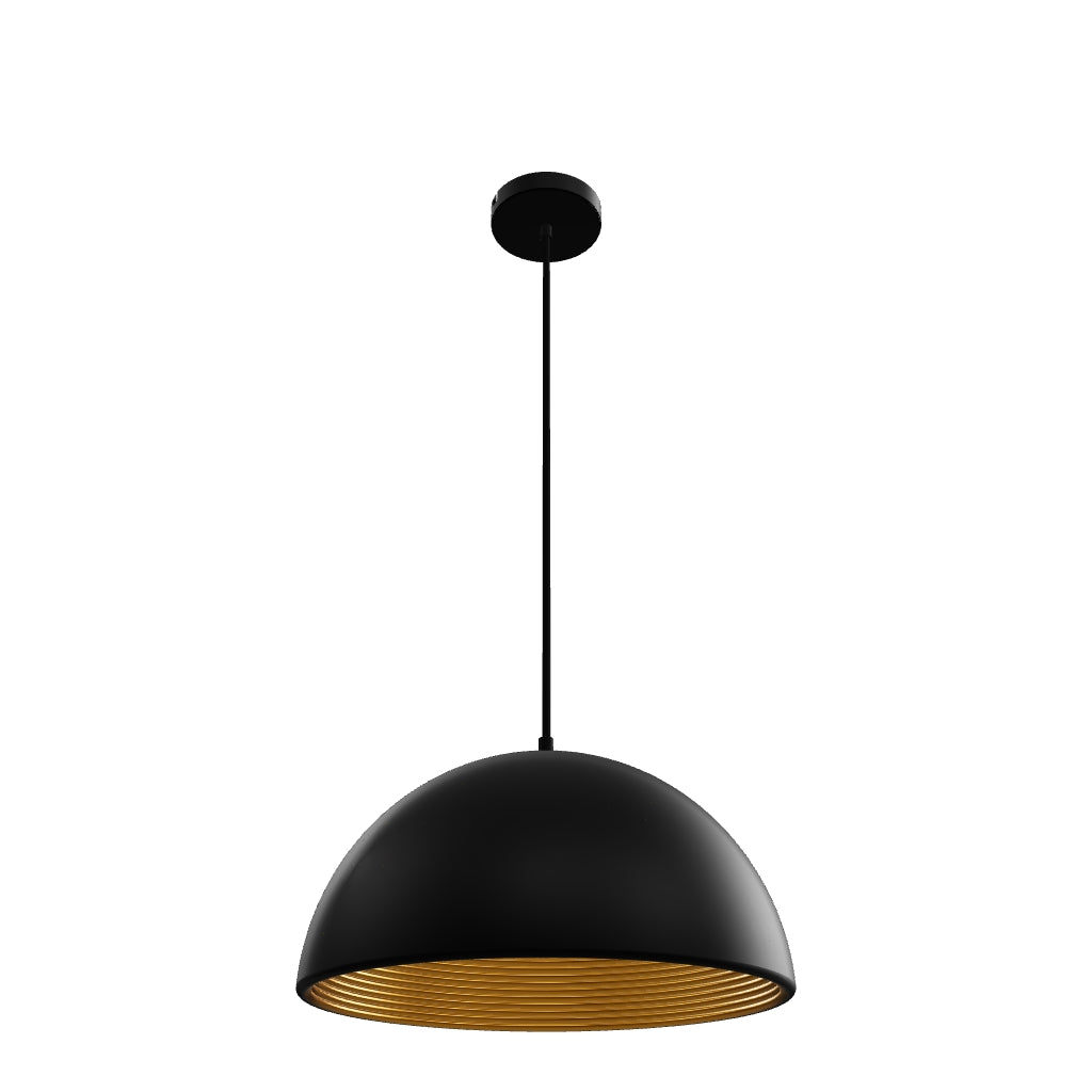 Lampada a sospensione con paralume in metallo laccato e riflettore interno.