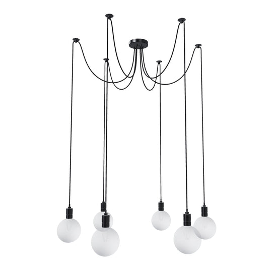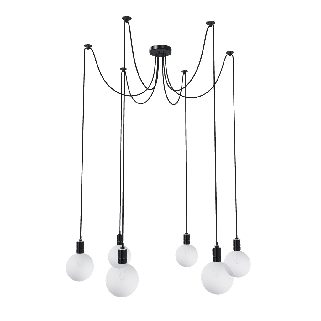 Lampada a sospensione con base per soffitto centrale e sei cavi di sospensione per lampadine con filettatura E27. Cavi di sospensione forniti con fermacavi da soffitto con possibilità di scegliere la distanza individuale dalla base. La lunghezza totale del cavo è 2m.