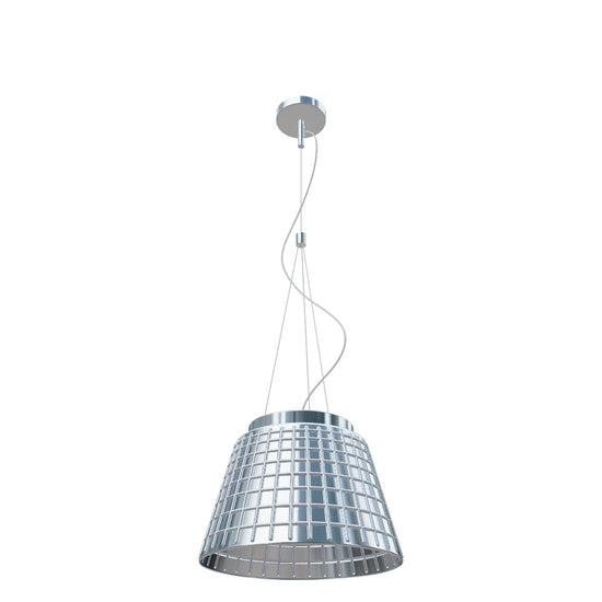 Apparecchio a sospensione con vetro massiccio strutturato. Il vetro è cromato su entrambi i lati. Se acceso, la sorgente luminosa risulta parzialmente visibile.