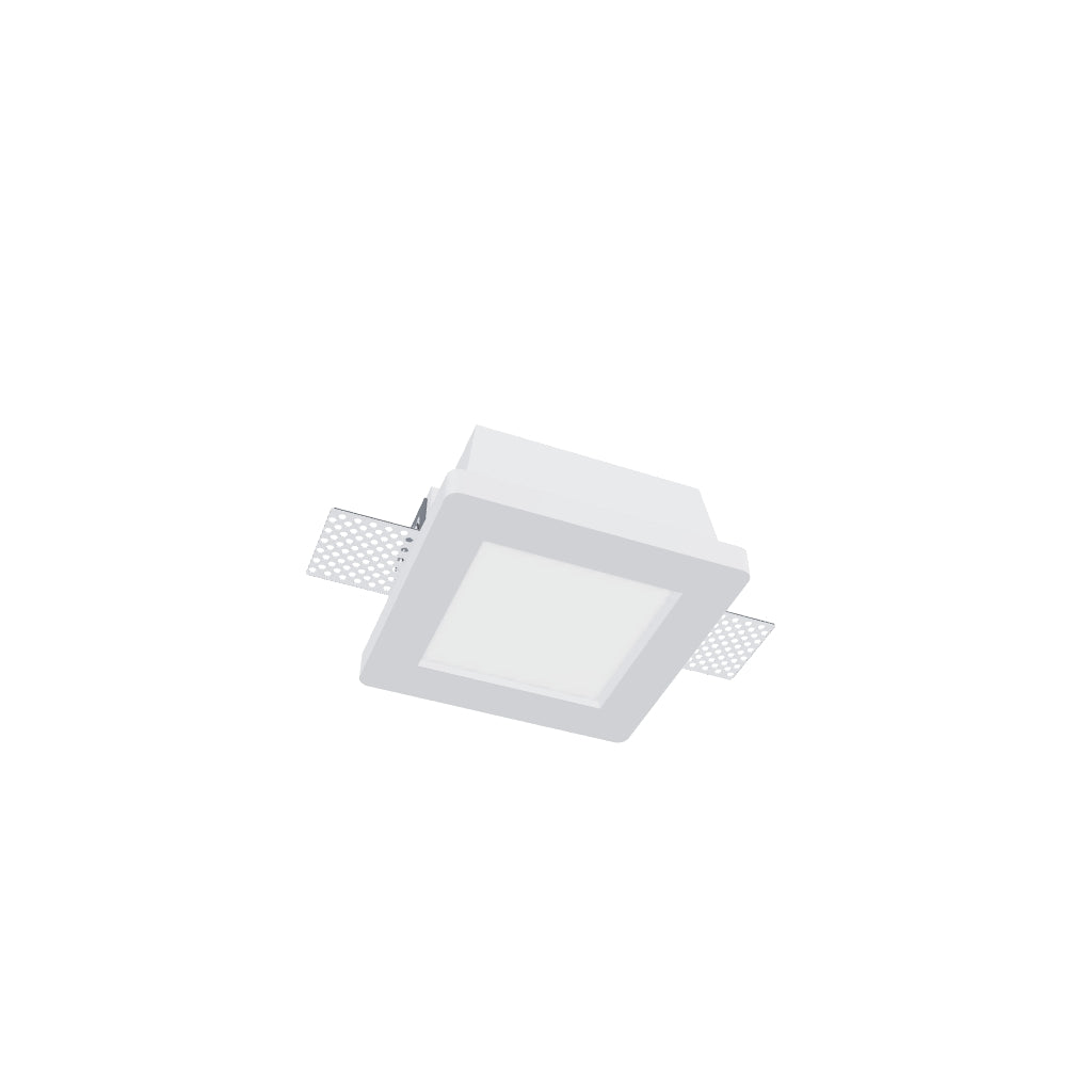 Apparecchio da incasso in gesso senza cornice con copertura di vetro satinato. Solo per l‘installazioni nel cartongesso. Adatto per sorgenti luminose con presa GU10.