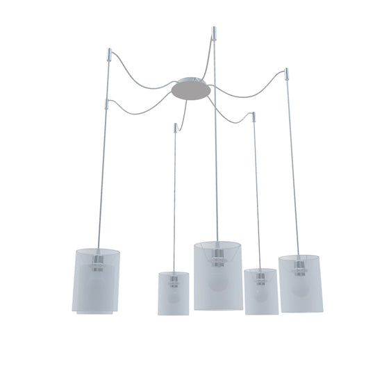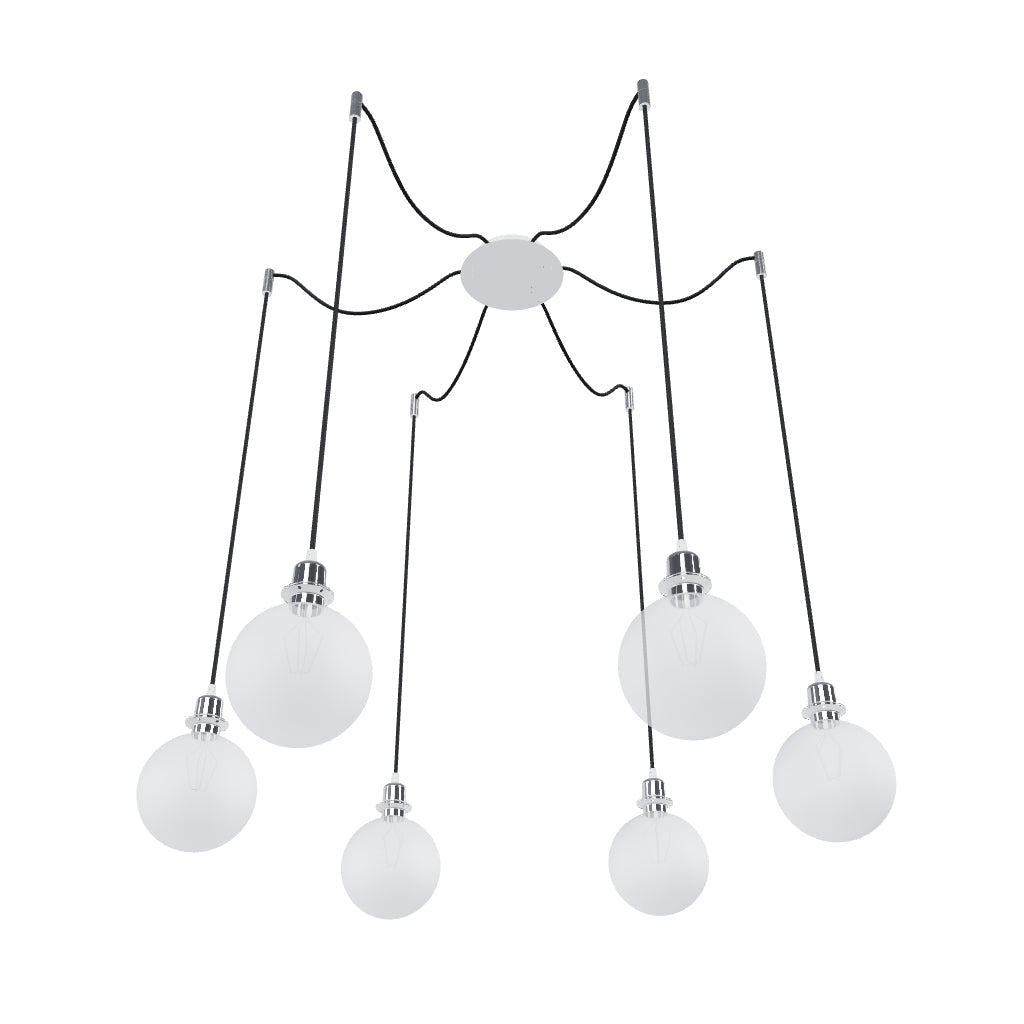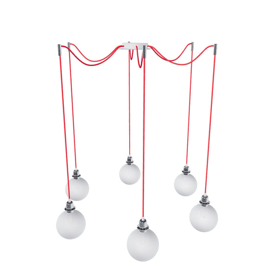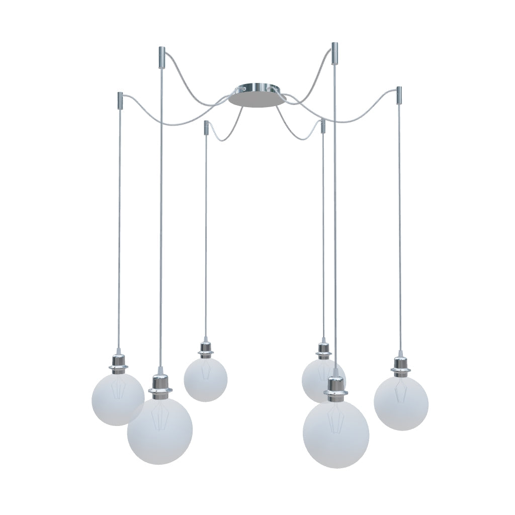 Apparecchio a sospesione con base centrale per soffitto e sei singoli cavi di tessuto con filettature metalliche E27, per uso con lampadine decorative o paralumi di tessuto adatti. I cavi di sospensione sono dotati di agganci da soffitto cromati, posizionabili ad una distanza individuale dalla base. La lunghezza totale di ciascun cavo è di 3 m.