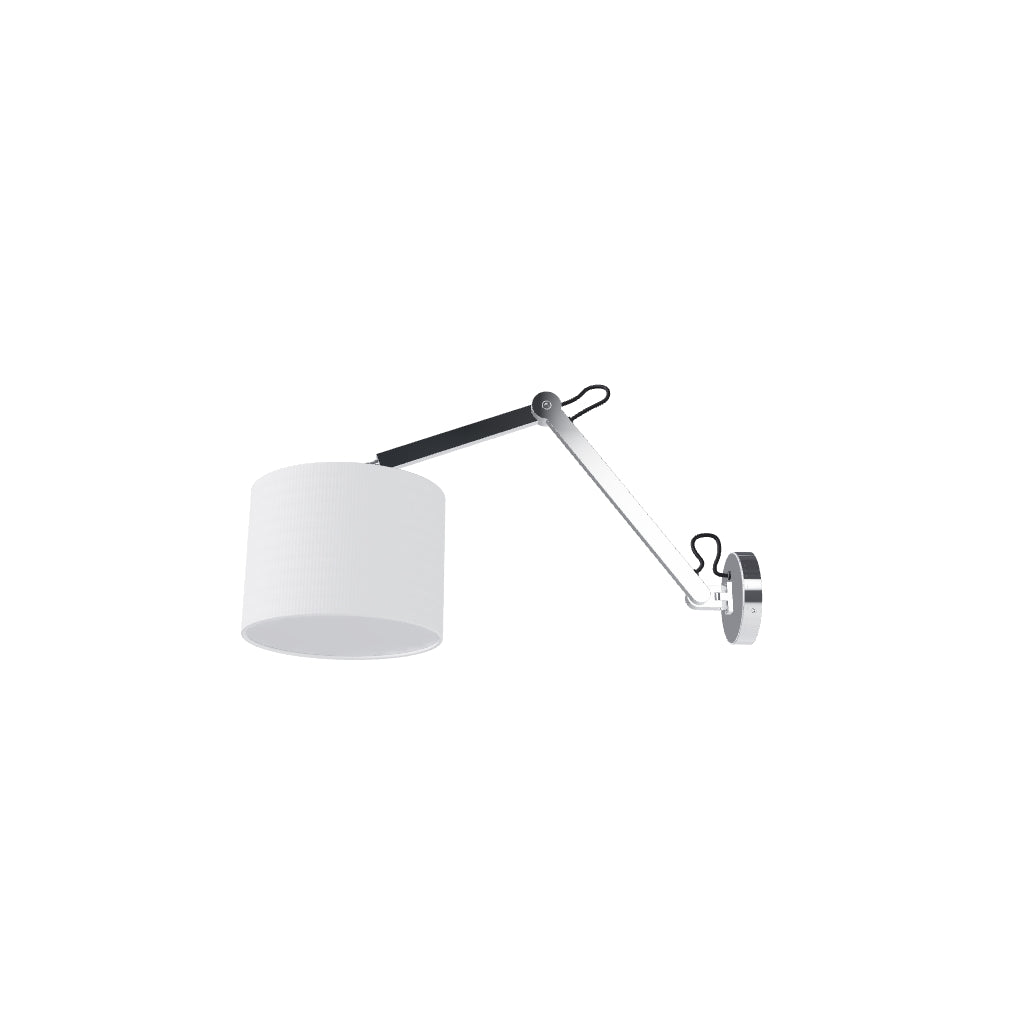 Lampada da parete con doppio braccio regolabile e paralume in tessuto.