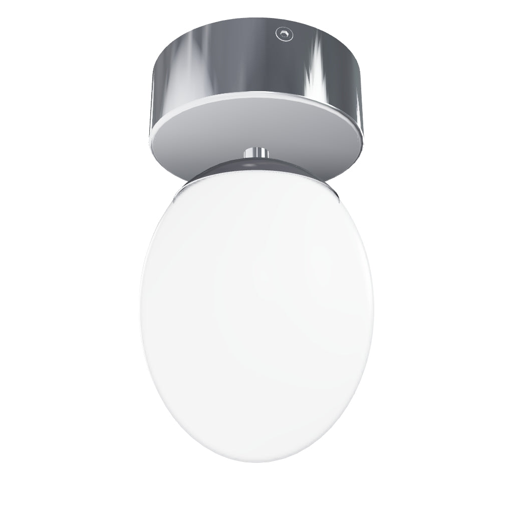 Plafoniera ovale in vetro con base cromata. Adatta per ambienti umidi.