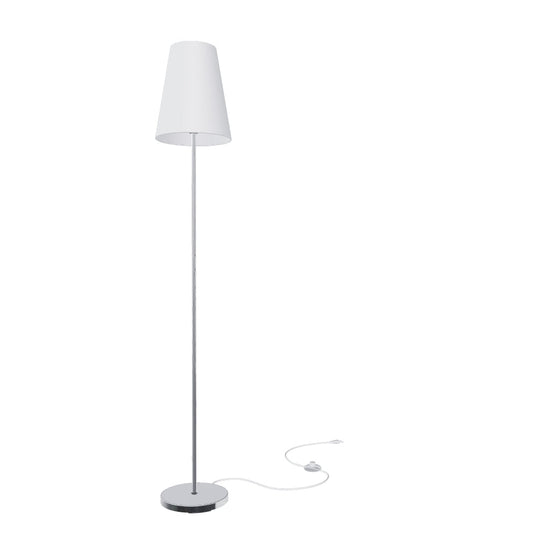 Lampada da terra con base cromata e paralume in tessuto. Adatta per sorgenti luminose a LED con filettatura E27.