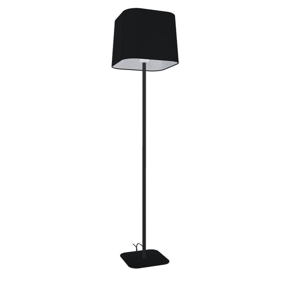 Lampada da terra con paralume tessile quadrato e con piedistallo metallico.