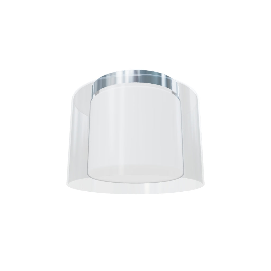 Plafoniera a LED in combinazione di vetro opalino interno e vetro trasparente esterno su base cromata, compatibile con filettatura E27. Adatta per ambienti umidi.